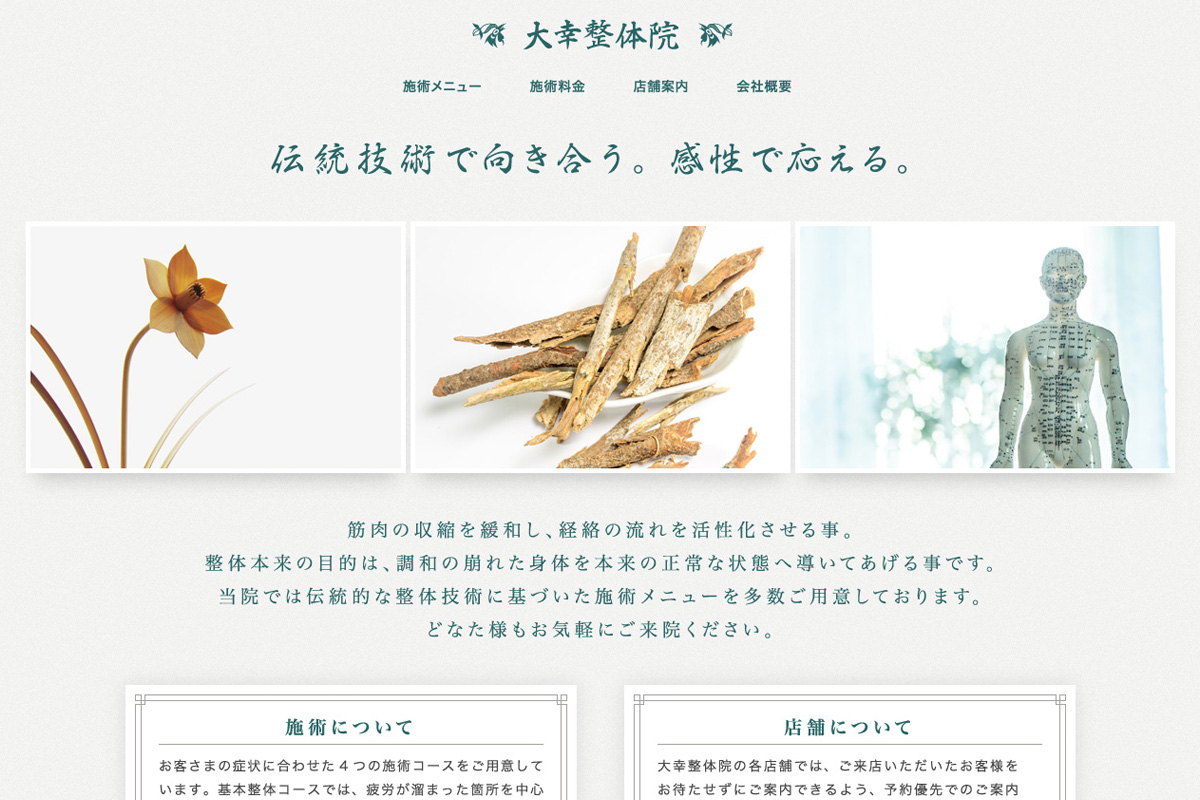 整体院グループ会社のコーポレートサイト兼、店舗のホームページをモバイル環境への最適化とトーン&マナーの再構築を目的に全面リニューアルしました。安心感、信頼感を感じさせる落ち着きのあるトーンをベースに初見の訪問者にも考慮したユーザビリティを構築しています。