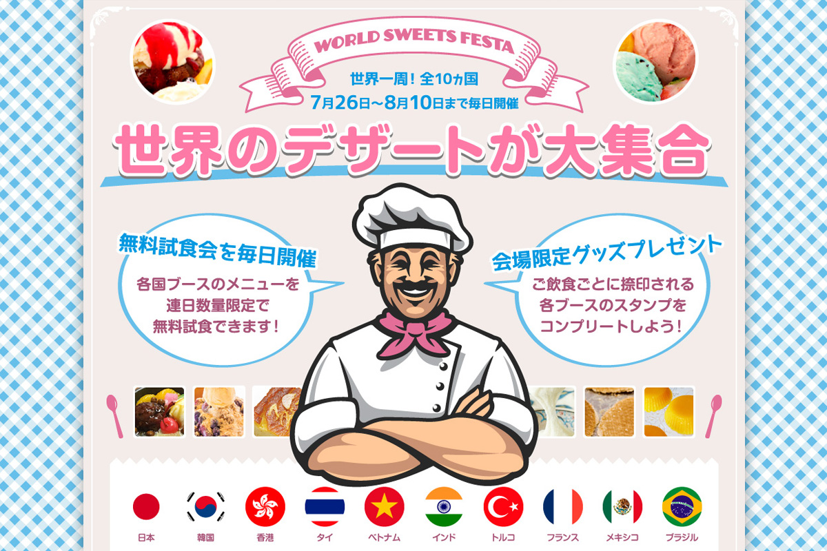 世界中の様々な国から集めたデザートを紹介するイベントのWebページを制作。公開期間が限定的であることに加えて内容の更新を前提としていないため、画像化したタイポグラフィーやアイコン、イラストなど複数の装飾素材と写真を多用したグラフィカルなページとして構築し、あえてレスポンシブ化を見送ったモバイルファーストのスケーラブルデザインです。