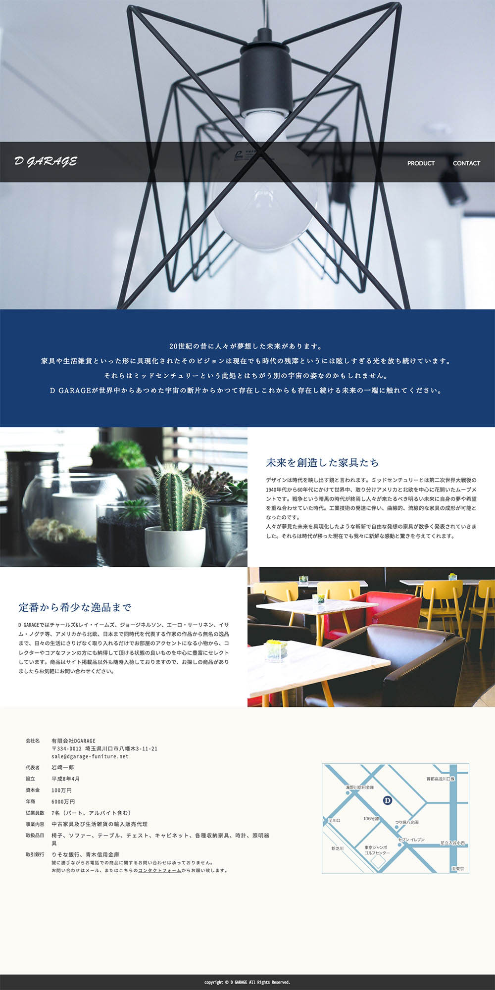 ミッドセンチュリーを中心としたデザイン家具、雑貨の仕入れ、卸売販売を行う家具会社のコーポレートサイトを制作。会社の運営上、自社サイトの構築が急務という状況から、必要最低限の情報のみで構成した簡易的な形で公開しました。