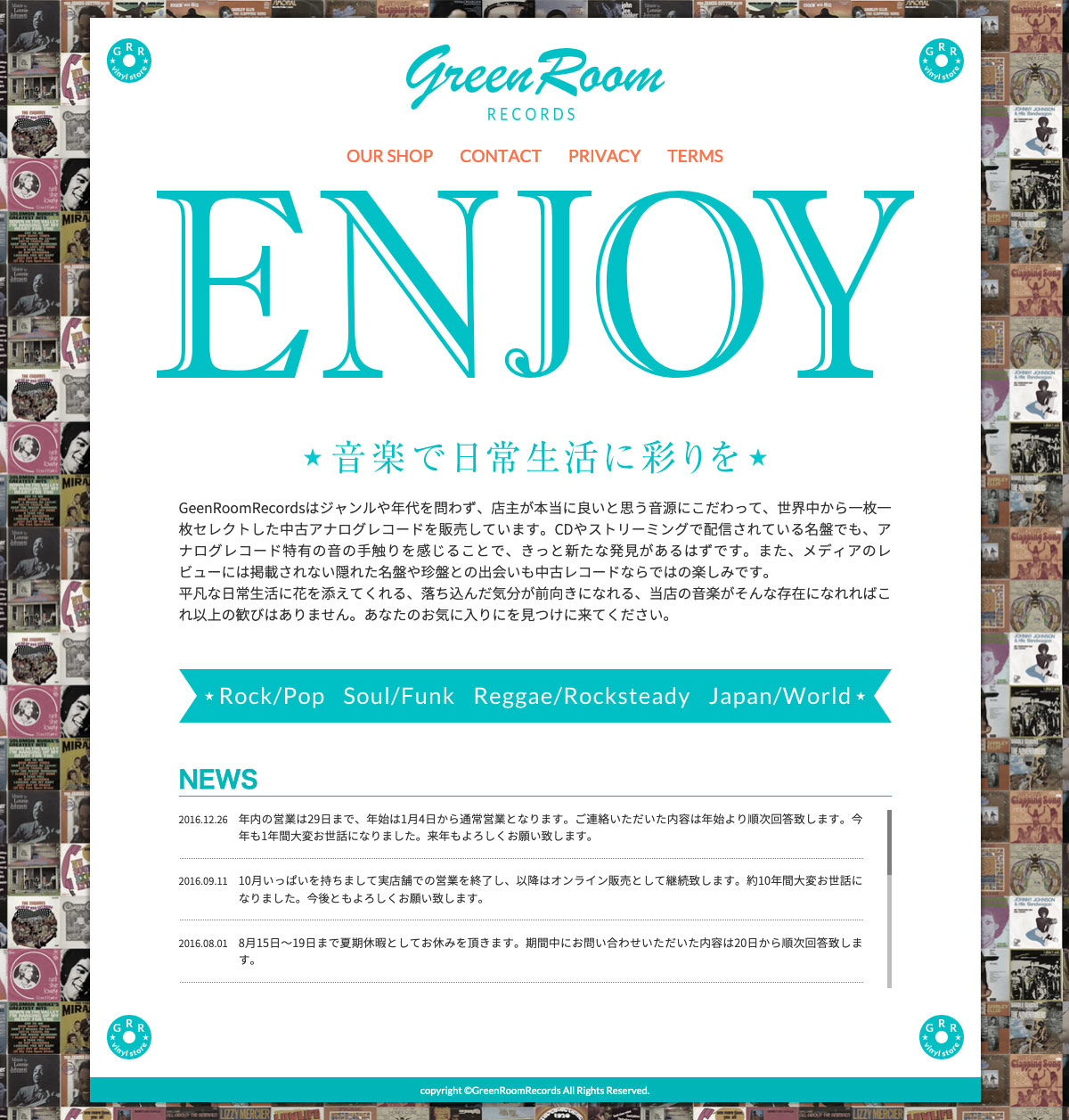 中古アナログレコード店の店舗ホームページ。将来的に公開予定のECサイトへのハブとなるサイトを目的に構築し、掲載情報は必要最小限に留めたシンプルな簡易サイトとして公開しました。イベントフライヤーに見立てた画面構成はモバイルファーストのレスポンシブデザイン。商品紹介を目的としたブログの開設を見越してサイト全体をWordPress化しています。