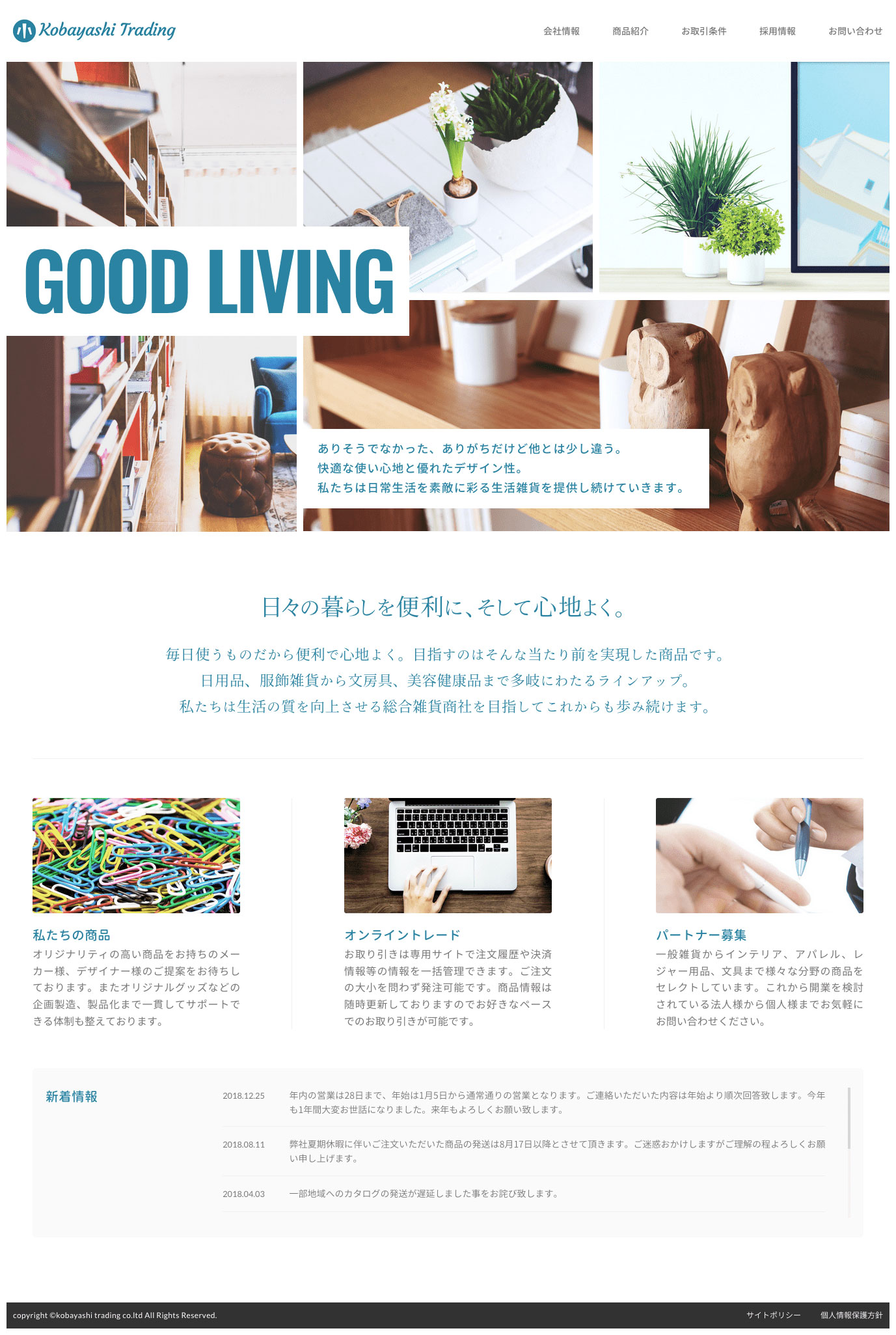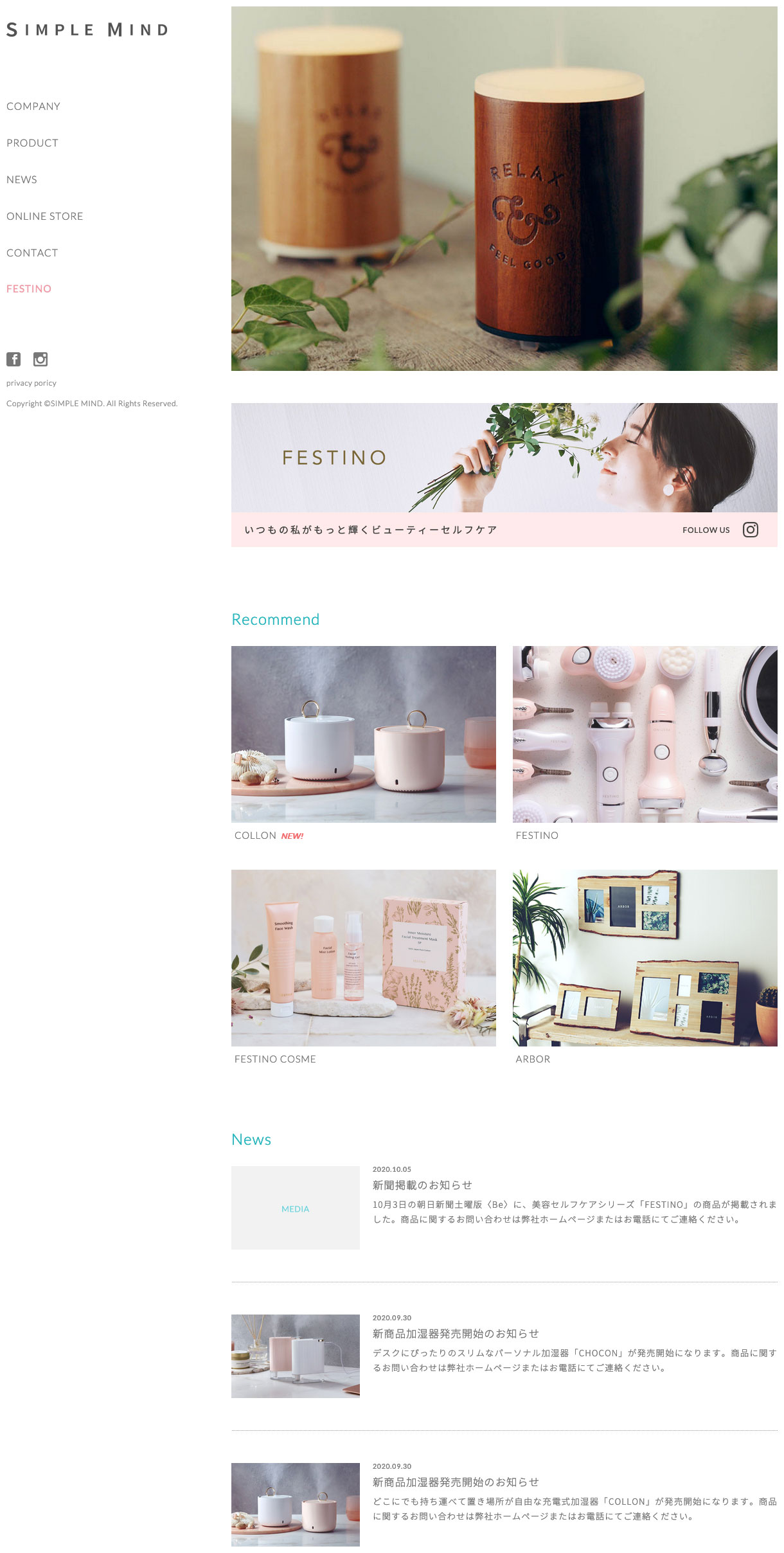 インテリア雑貨、美容、デザイン家電の企画製造会社のコーポレイトサイトを制作。自社製品の紹介を軸に、明るく清潔で透明感のあるトーン&マナーで全体をシンプルにまとめています。