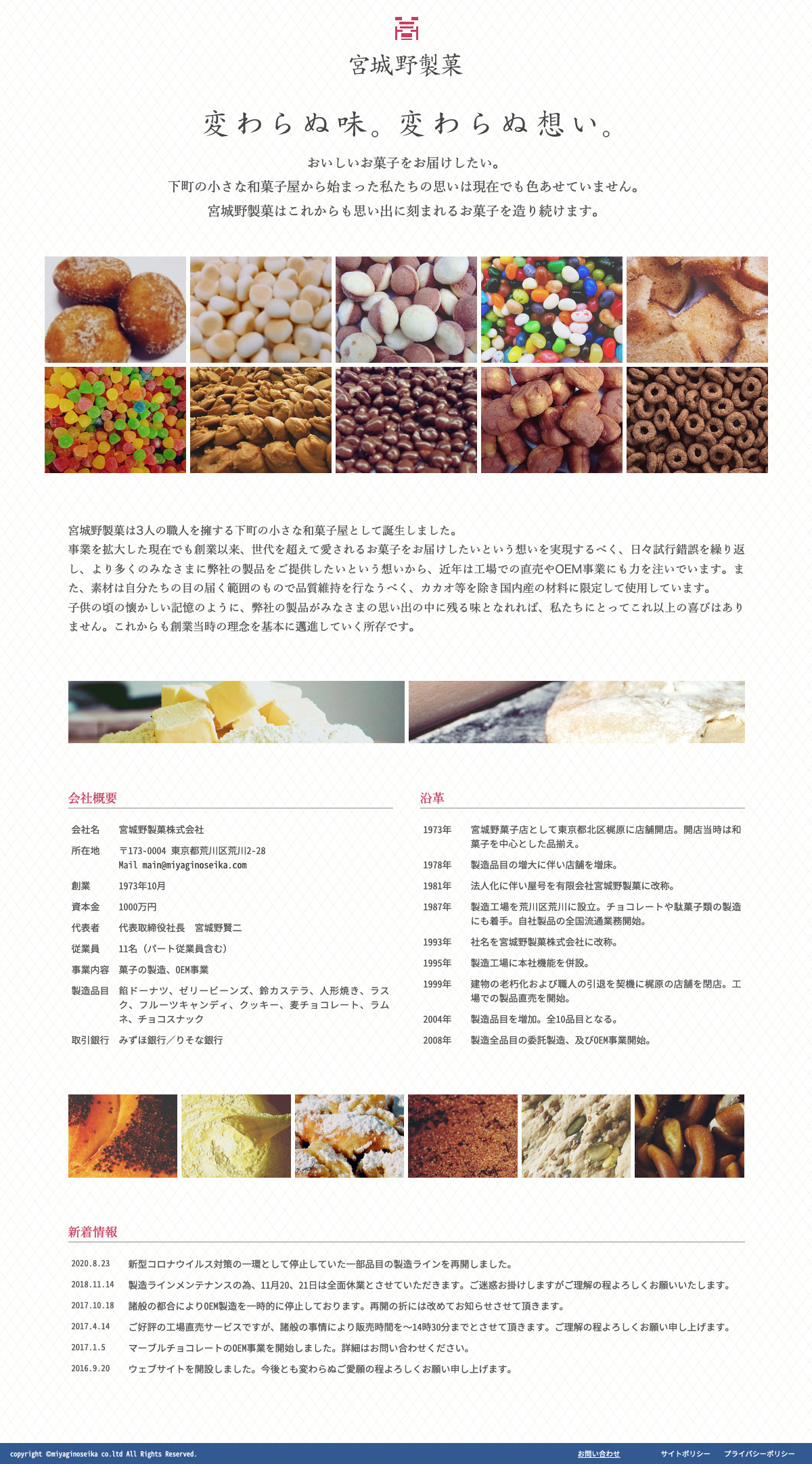 菓子製造会社のコーポレートサイト。過剰な演出を廃し、必要最低限の情報と製造品目の紹介を中心に構成し、事業の実直さと信頼感を想起させる飾り気のないトーンとライティングを中心に全体をシンプルに仕上げました。