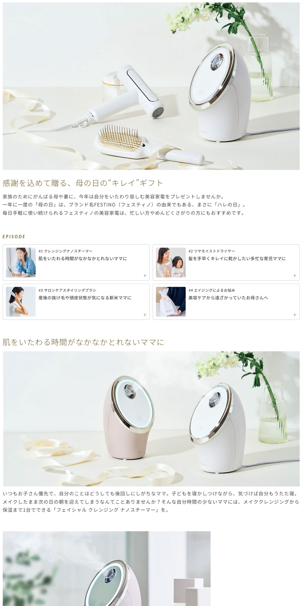 母の日をテーマに複数の製品を訴求した美容家電の販促キャンペーンページを制作。製品のイメージや使用シチュエーションまで写真撮影も担当しています。