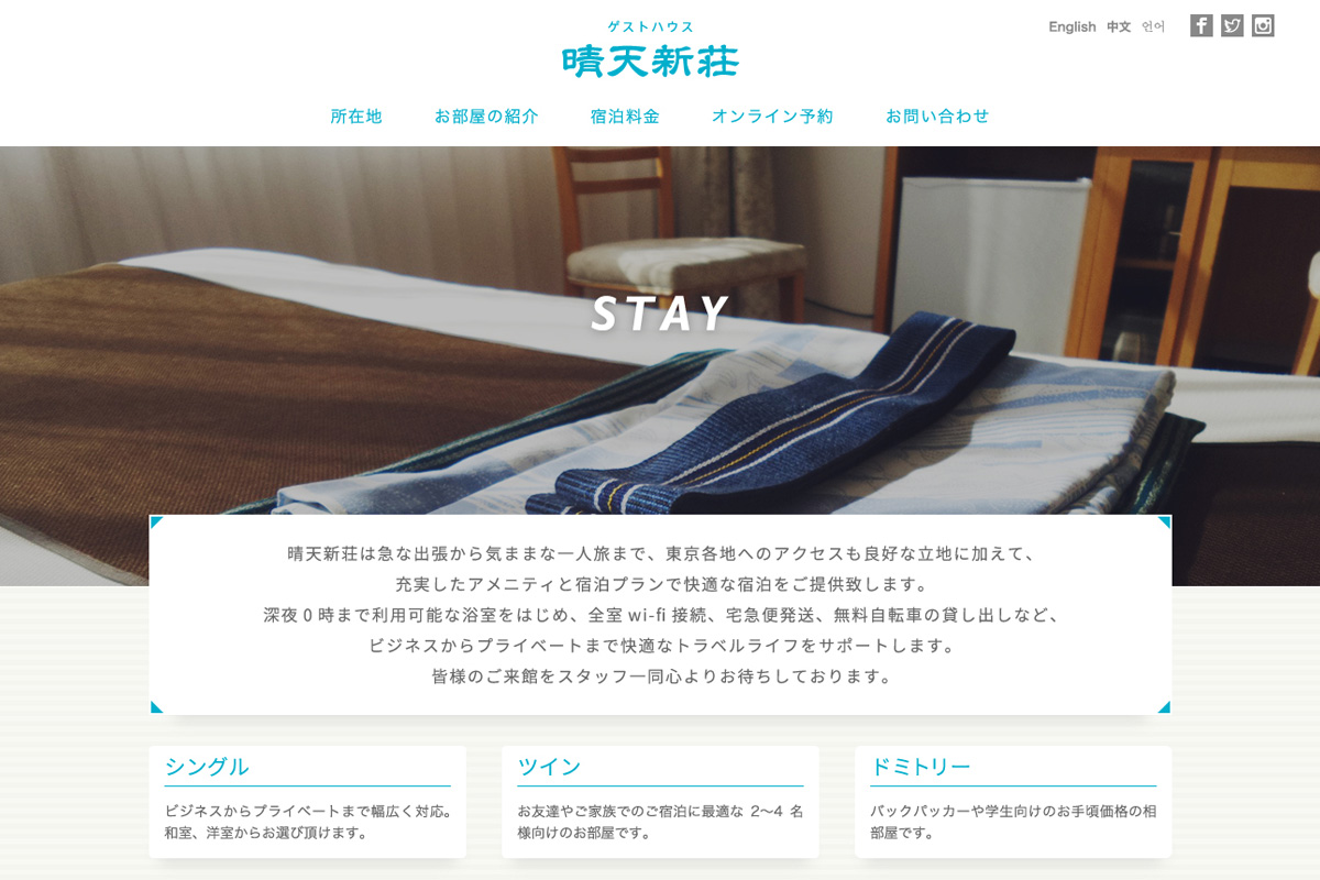 ホステルのホームページ。初めての訪問者に考慮した導線とページ構成で簡潔に構造化しベーシックながら落ち着きのあるグリッドレイアウトをベースに構築しています。モバイルファーストなレスポンシブ仕様でUIなどもタッチデバイス向けに最適化。あえてCMS化は行わずSNSや予約システムなど外部サービスと連携した運用で構築コストも圧縮しています。