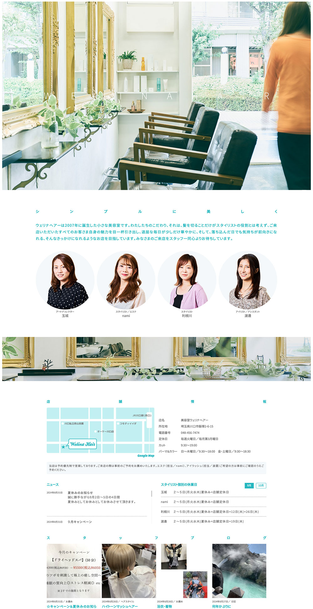 美容室の店舗ホームページ。店舗情報やメニューの紹介を中心としたモバイルファーストなレスポンシブデザインです。WordPressによるオリジナルブログも併設しています。スタッフのポートレートをはじめとした写真撮影も行いました。
